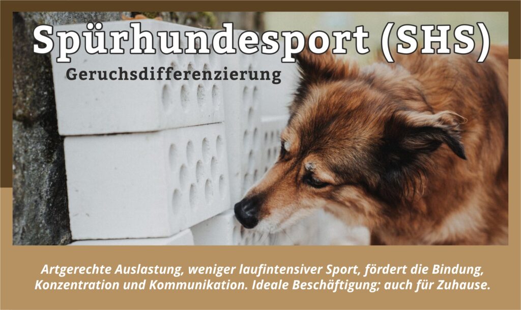 Beim Spürhundesport (SHS) lernt der Hund den spezifischen Materialgeruch seines Suchgegenstandes kennen und wird ihn später aufspüren können. Dabei sind die Bereiche Trümmerfeld, Flächensuche und Behältersuche möglich. Hat er den Gegenstand gefunden, zeigt er ihn mit einer passiven Anzeige an, in dem er sich davor ablegt, mit der Nase am Ziel.